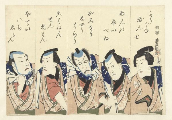Utagawa Kunisada created this woodblock print of actors from the play Satomi Hakkenden during a time when Kabuki theatre was a major form of entertainment in Japan. Here, Kunisada captures the expressive faces and elaborate costumes of the actors. These elements were essential to Kabuki's appeal. The intensity of the actors’ expressions, combined with their stylized makeup, allowed audiences to easily identify characters and their emotional states. The artist blurs the line between reality and representation, inviting us to consider how identity is constructed through performance. The print is not just a record of a theatrical event; it's a cultural artifact reflecting the social values and artistic trends of the Edo period. Kunisada elevates these actors, whose roles often involved portraying a range of social identities, from warriors to peasants, thus shaping and reflecting societal norms. This artwork provides a glimpse into a world where art, entertainment, and identity were deeply intertwined, inviting us to reflect on the fluidity of identity, and its performance both on and off the stage.