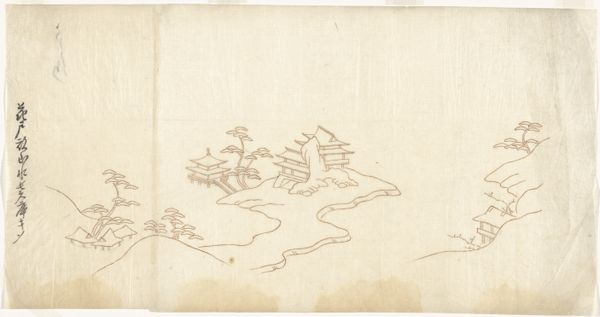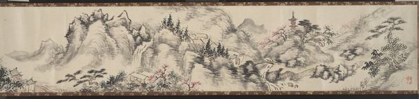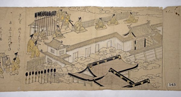 Editor: This is a section from *Albums of scenes from The Tale of Genji*, made between 1600 and 1700 by Tosa Mitsunori. It's crafted with ink on paper. The bird’s-eye perspective is interesting, and the wispy clouds add a sense of mystery. What's the significance of this viewpoint? Curator: The elevated perspective isn't just about aesthetics. Think about how traditional East Asian art often employs a floating perspective. It's less about mimicking reality and more about presenting a symbolic landscape, one that transcends the limitations of earthly viewpoint. The clouds, then, act as visual anchors but also conceal and reveal, hinting at hidden narratives and unspoken emotions. It also reflects, possibly, an attempt at reflecting multiple timelines. Do you notice the patterns in the borders? Editor: Yes, the geometric shapes are very precise, which contrasts the amorphous clouds. They give an insight into the underlying structure. How do the geometric aspects of the scene relate to the narrative itself? Curator: Geometry can signify order and societal structures, mirroring the rigid courtly life depicted in The Tale of Genji. Consider how each shape contains certain symbols or signifiers. The positioning of the figures amidst this geometric framework – how they adhere to it or perhaps disrupt it – speaks volumes about their roles and desires within that society. Consider also how memory itself can seem geometric or ordered. Does this impact your interpretation? Editor: That’s a great point. So the ordered structure of the album actually underscores both the elegance and the constraints of courtly life depicted. I’m now considering it less as a singular depiction, and more as an archeological representation. Curator: Precisely. By deconstructing the visible elements, we’ve glimpsed the profound psychological and cultural landscape embedded within it. Editor: I think I am starting to see this work less like a picture and more like a historical document with psychological and symbolic layers!