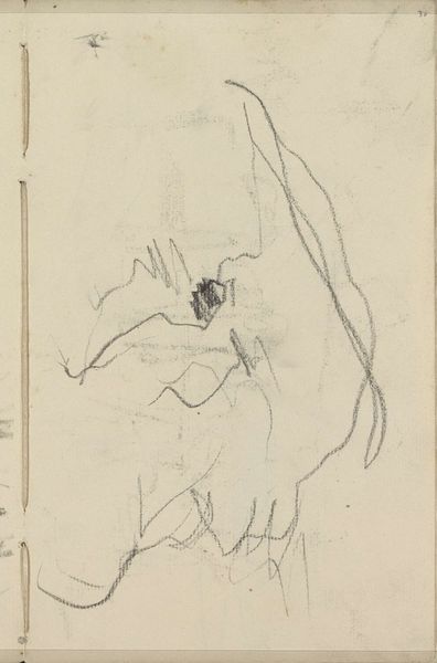 Editor: This is George Hendrik Breitner's "Man met zijn hand bij het achterwerk van een andere man," created sometime between 1886 and 1923, using pencil on paper. It's a very quick, loose sketch, almost like a doodle. What do you see in this piece beyond its seemingly simple subject matter? Curator: Beyond the immediate depiction, this sketch prompts us to consider the dynamics of the male gaze and representation. Breitner, known for capturing Amsterdam street life, presents a provocative interaction. Considering prevailing societal norms of the late 19th century, how might this sketch challenge or subvert notions of masculinity and propriety? Editor: I hadn't really thought about it that way. It just seemed like a casual drawing, but framing it within the context of gender and social norms makes me reconsider its potential meaning. Do you think Breitner was intentionally making a statement? Curator: It's difficult to ascertain intention definitively. However, placing the sketch within the trajectory of Breitner's oeuvre and the broader artistic landscape of his time reveals a fascination with the human form and its relationship to social spaces. We must ask: Whose gaze is privileged here? How does this fleeting image speak to power dynamics, desire, and visibility? Editor: So, even a seemingly simple sketch like this can be a site of complex social and political commentary. I'll definitely look at sketches differently now. Curator: Exactly. It highlights how even preliminary artistic explorations can offer invaluable insights into the artist's world and the societal structures they inhabited.
