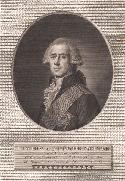 Editor: This is an etching and engraving of A.P. Bernstorff by J.F. Clemens, dating back to sometime between 1748 and 1831. It’s a fairly standard portrait of a nobleman, but what strikes me is how serious he looks. What's your take on it? Curator: Well, portraits, especially those rendered with the precise techniques of etching and engraving, were tools used to solidify power and construct identity in the 18th century. Consider how Bernstorff is posed, clothed, and framed. How might this image have contributed to the construction and maintenance of his public image? Editor: So, beyond just a likeness, it's presenting a specific idea of who he was meant to be? Curator: Exactly. Think about the historical context. Bernstorff lived through a period of intense social and political upheaval. How did figures like him navigate the shifting landscape of power, privilege, and emerging ideas about human rights and liberty? The seriousness you mentioned, does it reflect a weighty burden of leadership or perhaps an anxiety about holding onto power? Editor: I see what you mean. It's not just a picture; it's a statement. I wonder if the artist intended that feeling of anxiety to be so prominent, or is that something that comes with a contemporary reading? Curator: That is the key. An artwork engages in constant dialogue across time, right? Our understanding of historical context is invariably shaped by contemporary values. How do we, as viewers from a later era, reckon with representations of figures who benefitted from systems we now critically examine? How does art such as this challenge us to reconcile history with our present understanding of justice and equality? Editor: This has given me a lot to think about, especially regarding the relationship between art, power, and our own perspectives. It's definitely more complex than I initially thought! Curator: Precisely. Art invites us to critically examine the narratives we've inherited and the power structures that have shaped our world. This engraving, seemingly simple, provides such insight.