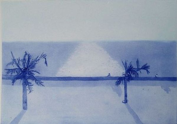 Editor: So, this is "On the Beach under Purple Sky," a 1934 oil painting by Istvan Farkas. The color palette really grabs you, doesn’t it? Almost ominous. I am drawn in by the feeling. What do you see in this piece? Art Historian: What strikes me is the context of its creation. This painting was made in 1934, a time of significant political and social unrest in Europe. The seemingly tranquil beach scene is rendered with a somewhat anxious energy through the purple sky and brushstrokes. Considering the political backdrop, what do you make of the figures placed distantly on the terrace? Editor: Well, they look like people at leisure. Are you thinking about the way society looks in times of turmoil? Art Historian: Precisely. Leisure itself becomes a charged subject. This hints at the art world being complicit through its own creation during tumultuous periods, showing moments of peace but potentially averting the ugly truth. Think about the artist making it too - does his context give clues? Editor: Oh! I didn’t consider how Farkas, being a Hungarian Jewish artist in that period, might be subtly commenting on privilege or perhaps even foreshadowing darker times through this scene of seemingly carefree people. It makes the "purple sky" more symbolic. Art Historian: Exactly! How cultural institutions frame such work shapes our understanding of its historical and societal echoes. Considering all of this information together - can you describe the role it has to you? Editor: Wow, I definitely see it differently now. I guess understanding the painting is also understanding the forces shaping art, its public role, and even the subtle politics it embodies. It seems the placid does have underlying chaos, once looked into properly! Thanks!
