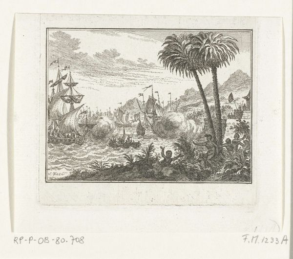 Editor: This is "Oorspronkelijke bewoners van Zuid-Amerika," or "Original Inhabitants of South America," an engraving by Johann Wilhelm Baur from 1636. It's housed at the Rijksmuseum. It feels like a depiction of first contact, with Indigenous people observing ships arriving. What strikes you about this piece? Curator: What I see is a potent reminder of the power dynamics inherent in representation. This image, created by a European artist, offers a glimpse into how Europeans perceived and, therefore, constructed their understanding of Indigenous South Americans in the 17th century. Notice how the figures are rendered – how does that framing shape our view of them? Editor: I see. They’re being observed as much as they are observing. They seem almost frozen in the artist's rendering of the scene. The figure standing appears adorned in clothes, which look almost European. How reliable is this depiction? Curator: Precisely. And that's where we must critically examine the role of the artist as a filter. This isn't necessarily an accurate portrayal but reflects a European perspective, one potentially laden with colonial assumptions and perhaps a need to categorize and even civilize. We have to question, whose story is truly being told, and who is being silenced or misrepresented? The figures’ relative lack of individualized features, for instance, could flatten the diverse experiences of Indigenous people. Editor: So, it's not just about the image itself, but about unpacking the power structures at play during its creation? The composition also shows them at the shore, gazing outwards towards incoming ships...a symbolic loss of land. Curator: Absolutely. By interrogating the image's historical and social context, we can begin to unpack the complex legacy of colonialism and its impact on identity, representation, and power. This is a landscape filled with gazes – each shaping and defining the other. Editor: I never considered the role of "the gaze" in historical images like this. It makes me rethink what I’m actually seeing. Curator: And that, precisely, is how we create a dialogue with history. Looking closely encourages the crucial interrogation of who is seeing, who is being seen, and whose narratives take precedence.