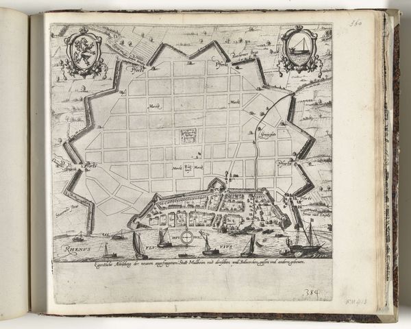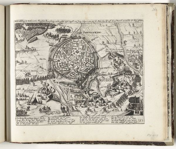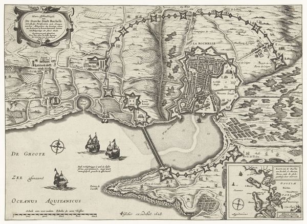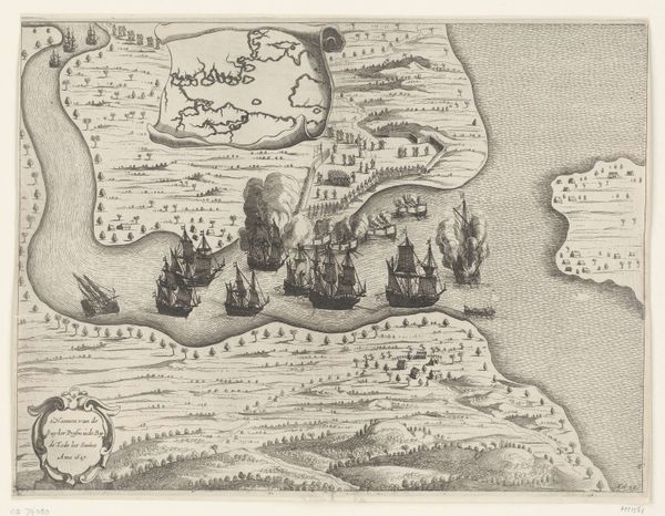 This anonymous etching, "Siege and Capture of Oldenzaal, 1626," presents a detailed aerial view, meticulously rendered with fine lines to map out a scene of conflict. The star-shaped fortress dominates the composition, its geometric precision sharply contrasting with the organic sprawl of the surrounding landscape. The structural layout divides the print into zones of action. The central stronghold, bristling with defensive architecture, is besieged by orderly ranks of soldiers, their linear formations emphasizing the tactical nature of warfare. The upper-right inset depicts a castle engulfed in flames, a stark semiotic signifier of destruction and conquest. The artist uses line and form to convey spatial depth, creating a sense of scale. The controlled lines allow the viewer to follow the siege's narrative and its devastating culmination. The print functions as a strategic document and offers insight into the military engineering and territorial struggles of the 17th century. It emphasizes the imposition of geometric order onto the natural world as a means of control and domination.