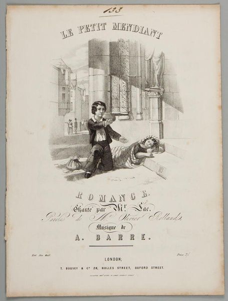 Curator: The artwork before us is a sheet music cover, titled "Ahasuerus Scène," with an illustration of the titular figure. The sheet music is undated, but held at the Harvard Art Museums. Editor: My immediate impression is one of burdened wandering. The stooped posture and raised hand seem to convey both weariness and perhaps a desperate plea. Curator: Ahasuerus, often known as the Wandering Jew, is a figure steeped in myth. He is believed to be condemned to wander the earth until the Second Coming for mocking Jesus on the way to the Crucifixion. Editor: The monochromatic palette and lithographic technique amplify the feeling of stark isolation. Notice how the artist uses hatching and stippling to create depth and texture, drawing our eye to the figure’s emotive expression. Curator: Indeed. The image encapsulates the enduring psychological weight of guilt and perpetual displacement. He represents not only religious transgression, but also the broader human experience of exile. Editor: And the musical context, as sheet music, adds another layer—the potential for catharsis, perhaps, or a lament that echoes through time. It’s a powerful, evocative image constructed through deceptively simple means. Curator: Agreed. It's intriguing how a single image can unlock such deep-seated cultural anxieties and enduring narratives of suffering.
