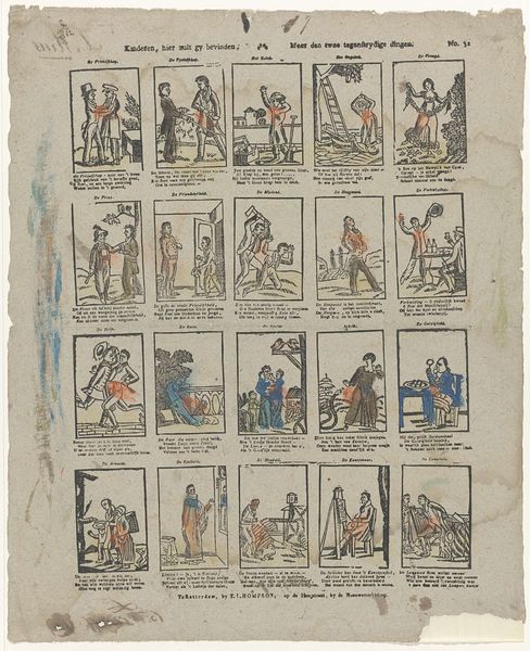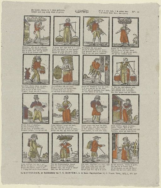 "Verscheidene personen / Differents personnages," which translates to "Various People / Different People", is a print made by Glenisson & Zonen. This colorful sheet presents a series of figures, each labeled with a brief description in both Dutch and French. The print offers a window into the social types and identities that were circulating in the Netherlands and surrounding areas. From pilgrims and soldiers to cooks and merchants, the figures represent a cross-section of society, each with their own role and story. The juxtaposition of Dutch and French text speaks to the cultural exchange and linguistic diversity of the region. The print engages with themes of identity and representation, offering a glimpse into how people saw themselves and others in this historical moment. I wonder, how did viewers at the time interpret these images? Did they see themselves reflected in these "different characters," and how did these representations shape their understanding of the world around them?