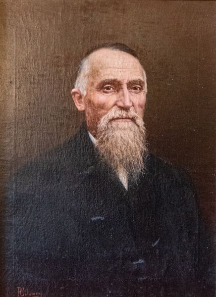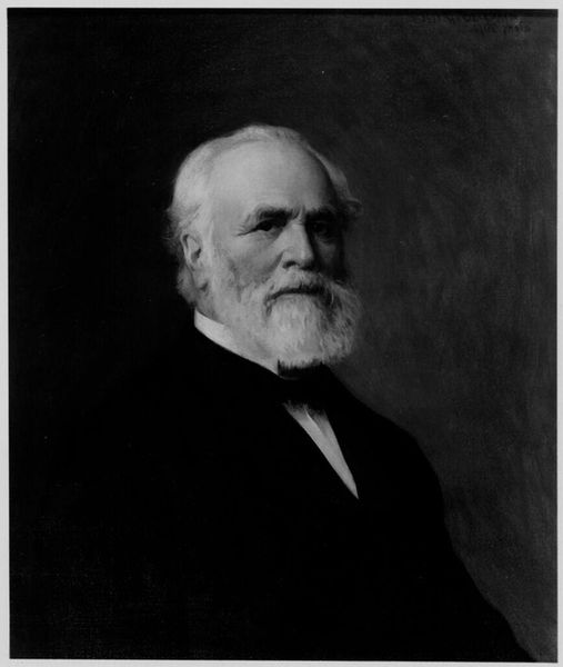 Editor: Here we have Frank Hector Tompkins' portrait of Ebenezer Rockwood Hoar. The somber palette certainly sets a serious tone. I'm curious, what strikes you most about its composition? Curator: Note how the artist uses light and shadow to create depth and volume, particularly in the face and hands. The stark contrast highlights the subject's features. Observe the texture achieved through brushwork, adding a tactile quality to the representation. Editor: It seems like the artist is using dark colors to create a serious tone. Curator: Precisely. The strategic arrangement of these elements dictates our engagement with the subject. The composition directs our gaze and evokes contemplation. Editor: That's a compelling perspective. I see it now. Thank you. Curator: Indeed. Visual language can speak volumes.