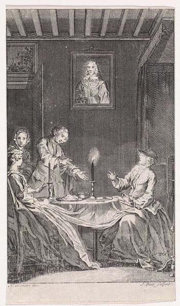 Curator: This is Jan Punt's etching, "Sophia in een kamer opgesloten," dating back to 1749. It's currently held at the Rijksmuseum. What are your first impressions? Editor: Stark, almost theatrical in its contrasts. The deep shadows cutting across the room create a dramatic tension, almost bisecting the composition. Curator: Indeed. The subject matter is from a genre painting, isn't it? We observe an interior scene executed through etching, utilizing ink on paper, elements that permit a very high level of control over the image making process. Let's consider the rococo period which values surface decoration, ornamentation, and playfulness, do you think those attributes translate in this printmaking work? Editor: Partially, at least. While the subject is charged with implied narrative and there are clear signs of wealth indicated, the restrained elegance of the line work tempers some of rococo's excesses, channeling emotion through form and contrast rather than overt display. The figures embody rococo sensibility through posture and gesture but their rendition and treatment is highly controlled, not emotive at all, is it? Curator: Right. The material conditions of printmaking – the engraver's tools, the printing press, the reliance on repeatable imagery – are key here. This wasn't about capturing a singular moment but disseminating an idea about a lady imprisoned in a room, as its title indicates. What power structures might influence such scenes, and whom it might appeal to? The choice of this scene must reflect and reinforce certain ideologies about how this narrative about a noblewoman would be perceived, correct? Editor: Undeniably. Semiotically, we see an interplay between confinement and longing. The architectural lines box Sophia in, and we can decipher emotions from gestures and composition, rather than rely only on a descriptive story. The bright rectangle behind her conveys a will to escape. Curator: Let's also note the printmaker's labor here. Consider the physical demands, the skill involved in rendering fine details across the etching, producing an image with wide distribution. And the price to put up for this item if one considers the socio-economical class, how much accessibility it might provide, what purposes it serves! Editor: A complex and fascinating intersection of technical execution, visual language, and material production. Curator: Absolutely, an image reflecting and shaping the social fabric of its time through repeatable, refined aesthetics.