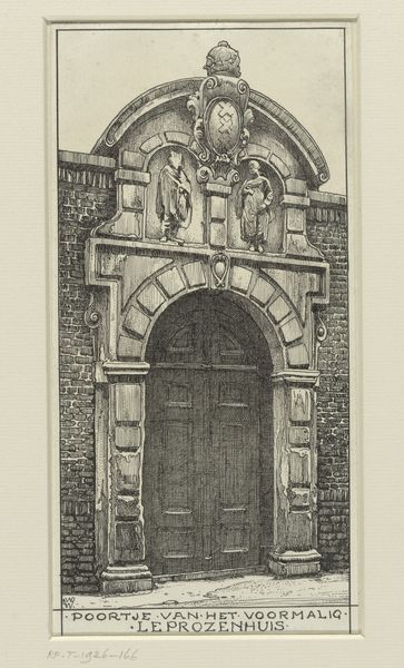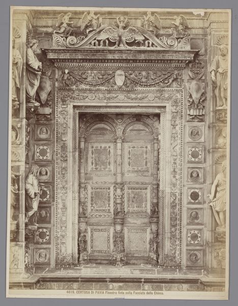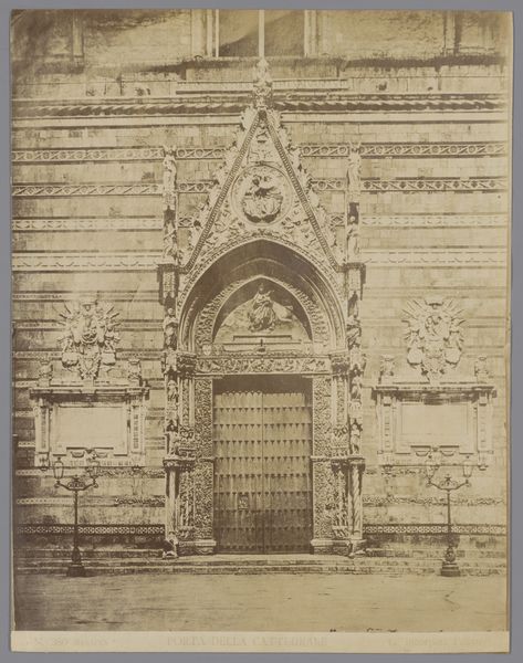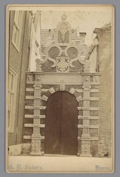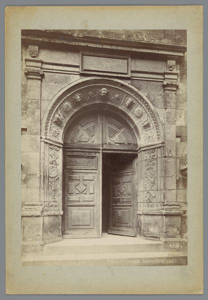 Editor: This is a photograph by Médéric Mieusement, taken sometime between 1875 and 1900. It’s titled “Toegangsportaal van het Hôtel de Vogüé te Dijon,” which I believe translates to "Entrance Portal of the Hôtel de Vogüé in Dijon.” The building appears old, formal and very symmetrical. What’s striking to you about this image? Curator: What draws my eye are the repeated heraldic symbols carved above the doorway. Notice how the fleurs-de-lis appear, subtly embedded in the stonework, signaling power and prestige. How do you think those emblems function here, so long after the medieval period that saw their first use? Editor: Well, the building looks old, but those symbols almost feel… intentionally archaic? Maybe a family was trying to give off the air of having deep historical roots, even if that wasn’t exactly true? Curator: Precisely. Think of heraldry not just as a family crest, but as a carefully constructed image. Each lion, each flower, is a calculated statement, a piece of visual rhetoric aimed at shaping perceptions of the family’s status and pedigree. What story do you think the Vogüé family was hoping to tell? Editor: A story of longevity and legitimacy, I suppose. Like they were always meant to be there, important members of that community. Curator: Exactly! And the choice to photograph and reproduce the portal, highlights its continued cultural importance and the ongoing power of those carefully curated images. What does the photograph add to that narrative? Editor: Maybe it solidifies it? If it's captured on film, that cements it further into the visual culture of the area. That’s fascinating, seeing how even architecture uses imagery to speak volumes. Curator: Indeed! Every carefully placed symbol speaks to a carefully constructed identity, enduring across generations. It reminds me that objects tell the history of their owners.