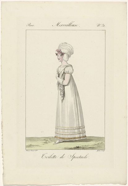This fashion plate, ‘Merveilleuse, No. 22,’ created around 1812 by Georges Jacques Gatine, presents a study in early 19th-century sartorial elegance, rendered with delicate lines and muted watercolors. The composition divides the figure into distinct visual zones: the elaborate feathered headwear, the soft, puffed sleeves juxtaposed against the bodice, and the lower portion with its bold plaid pattern. This deliberate structuring invites us to consider how each element contributes to the overall effect, creating a dialogue between texture and form. Gatine’s use of line to define shape and space flattens the figure, emphasizing silhouette over volume. This flattening can be interpreted as a commentary on the period's aesthetic ideals, where fashion served as a signifier of social identity and cultural values. The plaid, a disruption of the smooth upper half, signifies a departure from neoclassical sobriety and an embrace of novelty. Ultimately, this print functions as a complex interplay of signifiers, reflecting the shifting cultural codes of its time. It reminds us that fashion, like art, is always a construction, negotiating between representation and reality.