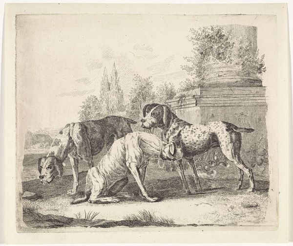 Jean-Baptiste Oudry painted 'Dog and Hare' with oils, presenting a hunting scene that captures both action and repose. The composition is structured by a contrast between the verticality of the dead hare hung against a tree and the horizontal resting dogs. Oudry skillfully uses light to enhance texture, observe how it illuminates the fur of the dogs, and darkens the lifeless hare. This contrast isn't just descriptive, it's a structured comment on nature's cycles of life and death. The positioning of the dogs, one alert and one recumbent, brings a semiotic dimension, evoking a sense of vigilance and languor that reflects broader aristocratic concerns. The muted palette reinforces the somberness, and the classical arrangement invites viewers to ponder the themes of mortality and the relationship between humans, animals, and nature. Oudry's formal approach encourages us to look beyond the surface and to contemplate the deeper cultural meanings embedded in this hunting scene.