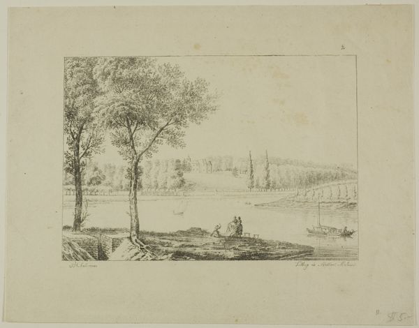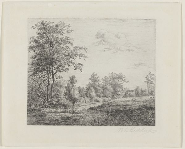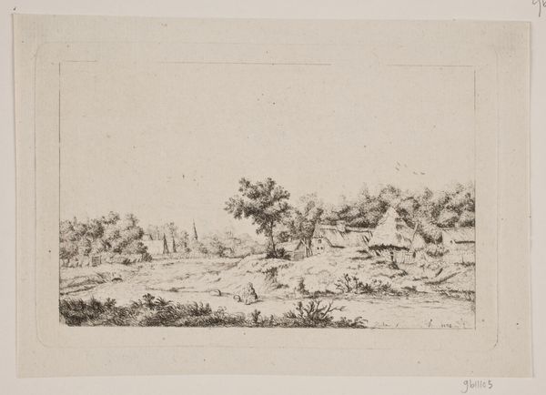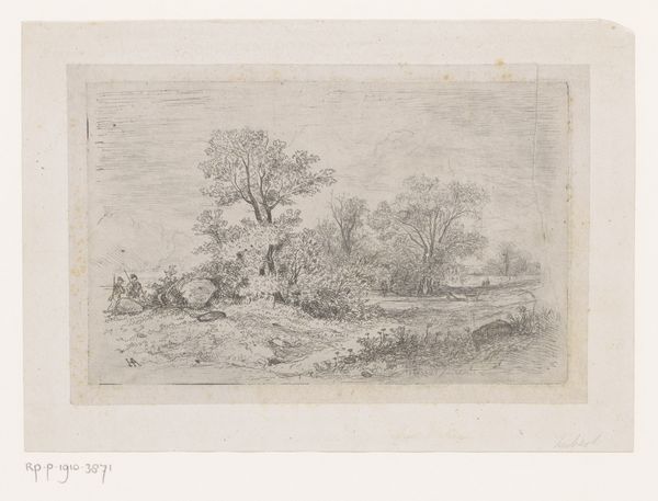This is "Landschap met boomgrens," or "Landscape with Tree Line," an etching by Mathilde von Hartenthal, created sometime in the late 19th century. Hartenthal was born in Austria and lived at a time when women artists often faced barriers in the art world. In this scene, Hartenthal subverts traditional landscape art by depicting a common, rural scene with great attention to detail. The composition draws attention to the line of trees on the right and the expansive fields in the background, evoking a sense of peace and openness. Consider the quiet, intimate nature of this small etching. What emotions might Hartenthal have been expressing through her choice of this subject matter and delicate technique? While on the surface the etching is a simple landscape, it also serves as a powerful statement about a woman's perspective in a world dominated by male artists. The personal and emotional dimensions of the piece are perhaps a way for Hartenthal to assert her presence and vision.