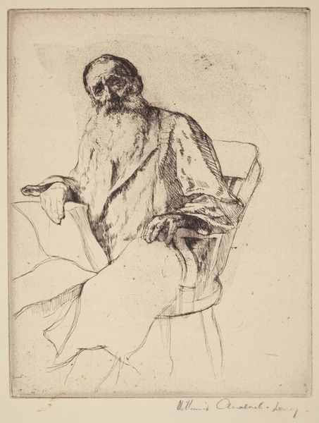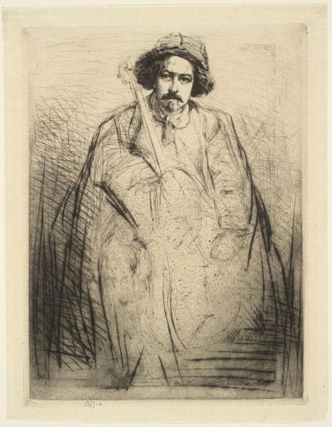 James McNeill Whistler created this etching, "Becquet," using drypoint on paper. It captures the intensity and depth of human character. Whistler, an American artist working in Europe, often challenged conventional artistic norms, and his focus on tonal harmonies paved the way for more abstract explorations. Here, we see the musician Becquet rendered with striking detail, yet there's a deliberate sketchiness that suggests a fleeting moment. The contrast between Becquet's direct gaze and the suggestive lines surrounding him creates a palpable tension. Whistler was interested in representing individuals outside the dominant social strata. By capturing Becquet's essence, Whistler elevated the status of his sitter. What do you think this work tells us about the relationship between the artist and his sitter?