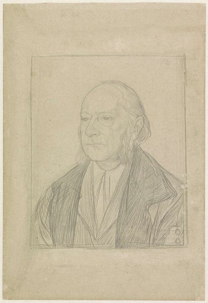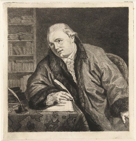 Louis Bernard Coclers created this etching, "Portret van de componist en etser Johan Antoni Kauclitz Colizzi," with a height of 276 mm and width of 238 mm. The portrait presents a study in contrasts, achieved through Coclers' masterful use of line and texture. The composer is depicted with a rich fur coat, its heavy texture rendered through dense, complex crosshatching, juxtaposed against the smoother tones of his face and the crisp lines of the quill pen he holds. This contrast isn't merely decorative; it speaks to the tension between the material world—the composer's physical presence—and the intellectual, creative realm he inhabits. The controlled, precise lines describing the musical instruments in the background serve as a kind of structural framework, against which the more fluid, expressive elements of the portrait play out. Ultimately, the artwork invites us to consider how the structure and form come together to embody both individual and cultural expressions.