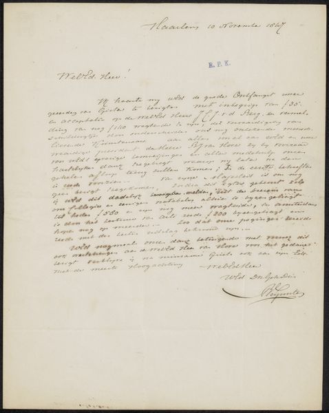 This is a letter to an anonymous recipient by Hermanus Petrus Schouten, written in Amsterdam in 1819. Its ideas and concepts are closely tied to the social and cultural context of the time. The letter creates meaning through its visual codes, cultural references, and historical associations. Made in the Netherlands, this letter emerges from a society shaped by religious beliefs, scientific inquiry, and artistic traditions. Schouten mentions being taught by his father and becoming a student, suggesting a formal artistic education. He praises God and nature, reflecting the influence of religious and philosophical ideas on artistic expression during this period. The letter offers a glimpse into the artist's personal and professional life, revealing his aspirations and engagement with the cultural values of his time. To understand this letter better, historians can delve into archival materials, biographical accounts, and studies of Dutch art and culture. The meaning of this artwork is deeply contingent on its social and institutional context, which includes the artist's training, the prevailing cultural values, and the artistic conventions of the time.