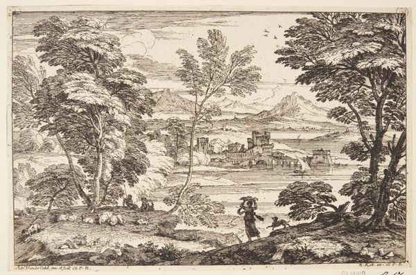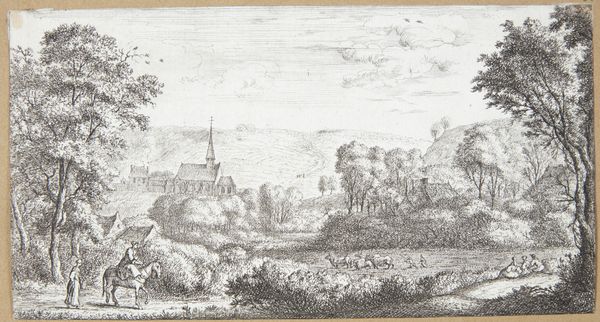 Editor: This delicate print, "Udsigt over Conflans," an etching and pen sketch made around 1650 by Reinier Nooms, is remarkable! There’s a tranquility in this seemingly simple landscape – the lone figures, the gentle slope... What do you see in this piece? Curator: What captures my attention immediately are the carefully placed buildings set against the backdrop of nature. Observe the relationship: a settlement at the foot of what appears to be a religious or civic structure further up the hill. In landscapes like these, particularly from this period, one should ask if they suggest not only physical spaces, but a moral or even divine order. The natural world supporting, leading to civilization, leading finally to a higher spiritual plane. Do you sense that layering of meaning here? Editor: I didn’t really pick up on that. It makes sense with the Baroque era's fondness for grand narratives. Are the individual elements also important? The trees, the figures, the buildings? Curator: Absolutely! Think about the trees, acting as silent witnesses, their forms echoing throughout history. They appear consistently in works across centuries as a sort of reminder about the passing of time, connecting the modern viewer with a collective memory of those who saw these same forms before us. Even those two small birds—the artist chose to represent those. What might their symbolic meaning be? Editor: Hmm…freedom, maybe? Or perhaps a visual suggestion that everything is connected? I find that so much to unpack from a single etching. Curator: Indeed. Each element contributes to the overarching sense of interconnectedness. Landscapes often encapsulate entire worldviews, allowing us glimpses into the values and beliefs of past cultures. What have you gleaned from our little visual archaeology exercise? Editor: That there's much more to this peaceful landscape than initially meets the eye! It feels like Nooms created a microcosm of the world, filled with layered symbols and philosophical ideas.