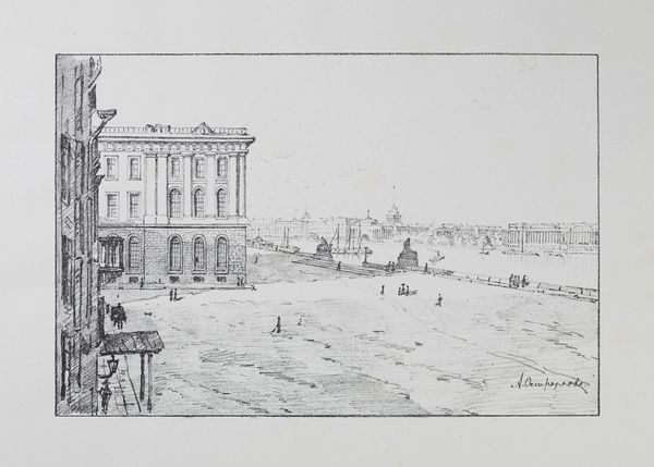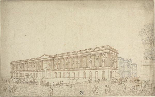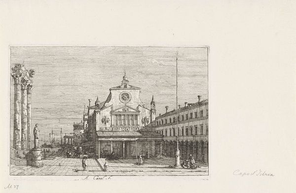 Editor: Here we have Canaletto's etching, "De Biblioteca Marciana te Venetië," dating from somewhere between 1707 and 1768. It feels incredibly detailed, almost like a photograph despite being a print. The architecture is so precise, and yet there's a looseness in the figures that gives it life. What catches your eye when you look at this piece? Curator: What captures me...well, it's more of a feeling than a specific detail. It's like stepping into Venice of the past. The lines vibrate, don’t they? Canaletto wasn't just depicting the architecture. It's a staged memory. Note the people - mere actors in Canaletto's Venetian theater, existing only to enliven the scene, and the sky which hints that something else entirely is more important. Does the blankness unnerve you at all? Or do you feel liberated from some conventional pressure? Editor: Liberated, actually! I hadn't thought of it that way, but the sky *does* make the Library seem to jump forward. So, he's kind of playing with perspective by leaving that space open? Curator: Precisely! It's as if he is saying, “Look, not just at this magnificent edifice, but at the essence of Venice, it's timeless energy." His technique in printmaking allowed him to replicate and distribute these scenes, which further cemented Venice as the destination of dreams. Do you think he achieved that here? Is your appetite to visit, to see more, sated or stirred? Editor: Definitely stirred! I want to walk right into that scene. It’s funny how a blank sky can be more inviting than a realistically rendered one. I would have never thought about it that way if we hadn't talked about it. Curator: Exactly, and sometimes art asks us to dream a little, to be active in the experience and let the work speak to your dreams in response!