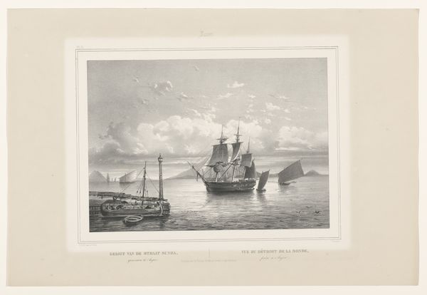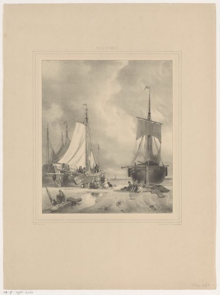 Editor: Here we have Cornelis Gerrit Verburgh's lithograph, "Gezicht op Rotterdam," created sometime between 1839 and 1847. It's quite striking. The atmospheric perspective makes the city feel vast, and the ships give it a real sense of bustling activity. What do you see in this piece? Curator: The first thing that grabs my attention is the careful rendering of the clouds, looming large, and mirroring the industrialization represented by the steamboats on the water. Note also the frame--very decorative! Think about what that framing device signifies--do you see a contrast between that romanticism and the budding industry within? Editor: I hadn’t considered that contrast, but it’s so obvious now! The ships pulling into port – are they symbolic of trade, or something else? Curator: Both trade and transition, certainly. Ships, since antiquity, carry potent symbolic weight, evoking journeys, connections between worlds, and of course, commerce. Notice how the people on the shore are small in scale. The rise of industry dwarfed individual experience, creating an anxiety about place in the world. The ornate frame also reinforces this concept of separation. Editor: That's fascinating. The size of the figures does now strike me, yes! Are you suggesting the artist is making some kind of statement, or simply representing society at that time? Curator: The choice to represent that transition at all *is* a statement, even if subtle. There’s nostalgia implied in the delicate framing of that imagery, coupled with an awareness of a quickly changing world. The ships point to broader European industrialization and trade networks that were deeply enmeshed with Rotterdam itself. Consider also, how Verburgh positions the viewer: separated from this "new" Rotterdam, almost longingly looking at a world they may or may not be a part of. Editor: That gives me a totally new way to approach this piece, considering the emotional complexities involved in industrial change! Curator: Absolutely. Visual symbols allow us to contemplate, reconsider, and remember what our places mean to us, as individuals and as communities.