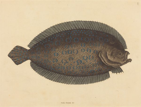 Editor: This is "C. Macrolepidotus," a drawing made with etching and ink by Charles Alexandre Lesueur between 1817 and 1821. I’m struck by the precision of the scales, the way the artist captured the texture and form. What's your perspective on this work? Curator: What interests me most is the materiality and labor inherent in its creation. The transition from observation to sketch, and then to the printmaking process itself - the etching, the inking, the pressure of the plate on paper. How does that labor inform our understanding of the "scientific" image? Was it collaborative labor? What of the distribution, the intended audience, the consumption of these images? Editor: That’s fascinating! I hadn’t considered the printing process as part of the artwork itself. You mentioned consumption. Were these kinds of images widely circulated? Curator: Exactly. Were they? How does this mode of production—etching—relate to the rise of scientific illustration and knowledge dissemination at that time? What constraints or affordances did etching provide over other reproduction methods? Consider the social context in which Lesueur was working; were these images meant for scholarly use, or did they also appeal to a broader public interested in natural history? Understanding the means of production is fundamental to grasping its meaning and impact. How does this differ, say, from a single, unique painted representation of the same subject? Editor: I see what you mean! By thinking about the process, the materials, the distribution of the image, we start to understand the artwork not just as a picture of a fish, but as a product of a whole system of knowledge and labor. Curator: Precisely! Examining art through this materialist lens reveals the intricate connections between artistic creation, social structures, and economic forces. The 'art' isn't simply the image, but a record of human endeavor, tied up with specific processes of production. Editor: This has given me a lot to think about regarding how materials and context shape our understanding of even seemingly straightforward depictions of nature. Thank you.