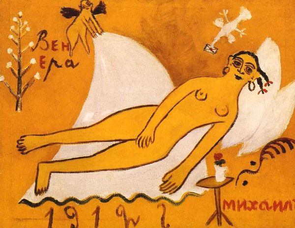 Curator: This is Pablo Picasso's "Lying Naked Woman (The Voyeurs)," painted in 1955. It’s an oil on canvas, showcasing one of his many explorations of the female form. What strikes you initially? Editor: It's unnerving. There's a vulnerability in the pose, almost childlike, juxtaposed with these jarring, almost aggressive angles and perspectives. The voyeurs implied in the title add a layer of discomfort, like we're intruding on something deeply personal. Curator: Precisely. The implied observers – those shadowy faces lurking in the background paintings – intensify that voyeuristic sensation. Consider the post-war context. Picasso’s nudes from this period often evoke feelings of unease, perhaps mirroring the anxieties and disrupted realities of the time. How do you interpret the way Picasso has deconstructed the figure? Editor: The fragmentation, the flattened planes – it feels like a battle between objectification and emotional truth. It's as if he's grappling with how the female body is seen versus how it's felt, or experienced by the subject herself. I am also impressed by his capability to put various themes such as voyeurism and objectification into a single work. It gives us an overall perspective on a period of great innovation and revolution. Curator: The way he twists perspective isn't just about aesthetic experimentation. It’s a radical confrontation with traditional artistic ideals, isn’t it? It breaks down any pretense of passive beauty and asks us to confront the complexities of representation. Think of how galleries operated then versus now: it was quite an act to paint the feminine form in such a liberated way, so publically. Editor: Absolutely. And it invites us to question our own gaze, to acknowledge the power dynamics inherent in viewing art, especially the nude. Do we perpetuate the voyeurism implied, or do we engage with the vulnerability exposed? Curator: I agree, it is more of a question, of our moral implications towards not only the painting but ourselves too. That tension, that self-awareness he instills in us, is what makes it a work that continues to provoke and resonate so powerfully. It asks something from us. Editor: It’s a fascinating work, and a great way to look into a dark side of beauty. Thank you.