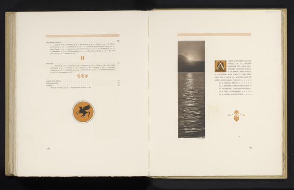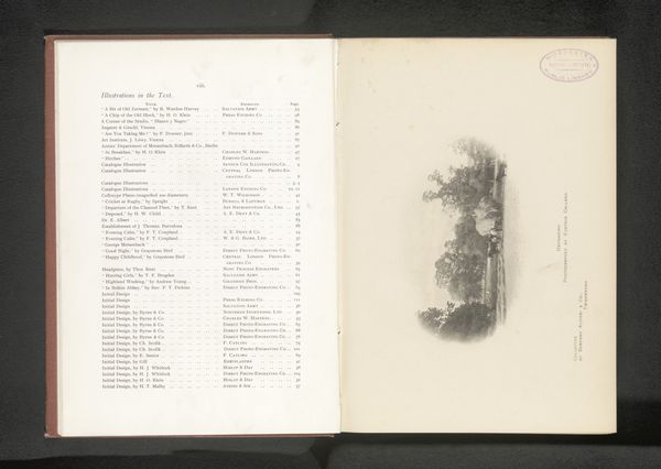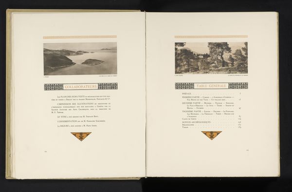 Curator: Well, isn't this striking? The soft greyscale hues and spacious composition project such serenity. What do you think of Frédéric Boissonnas’ photographic etching, "Stymphalusmeer in Arcadie," created before 1910? Editor: There’s a calculated framing at play here. Boissonnas gives us a rather picturesque scene but simultaneously boxes it in—literally—on the page. It points to the book's nature as a collector’s object. How do you interpret his choices in rendering? Curator: The tonal range, carefully printed on the textile page, really elevates the texture. He plays with atmospheric perspective— the misty lake bleeding into those hills. This photographic manipulation and the specific print methods draw our attention to the staging of “Arcadie”. How might contemporary eyes receive such an idealized vision of the pastoral, framed so consciously within colonial modes of viewing? Editor: Precisely! Early photography played a pivotal role in constructing perceptions of place, and what we are seeing here are essentially pre-packaged visual narratives for consumption. He shapes how a place is understood, feeding certain expectations and overshadowing lived experiences. I'm particularly intrigued by the index on the facing page – it almost positions the image as empirical evidence supporting an already-written narrative, not to uncover lived life, but to supplement existing theory. Curator: Yes, absolutely. Note too the delicate balance between objective documentation and romantic idealism achieved by photographic etching as a printing method, particularly prevalent at the time, and one has to wonder to what extent they are truthful versus idealized renditions. I wonder how someone rooted to the territory it represents may see his composition and artistic gestures differently from a tourist or scholar referencing "table des matières". Editor: A thoughtful point to keep in mind, and it makes you really question what are the politics inherent to making photographs and rendering landscape in ink that seem beautiful at first glance. Curator: Indeed! A beautiful landscape imbued with constructed narratives.