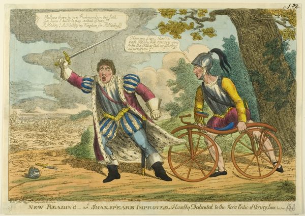 Charles Williams created this print, "Leap Year," employing etching and hand-coloring to bring its satirical scene to life. The composition, vibrant despite its political bite, immediately draws you in with its dynamic arrangement of figures and symbolic elements. The print presents a topsy-turvy world where traditional power dynamics are inverted. Visually, the exaggerated figures and the chaotic piling of 'taxes' and 'assessed taxes' overwhelm the senses, mirroring the perceived burden on the common citizen. The central figure of John Bull, emblematic of England, is quite literally ridden over. This deliberate overturning of social order—a woman dominating John Bull—challenges fixed notions of authority and control. The layering of visual elements—from the woman's whip to the strewn documents—serves as a semiotic system, each detail contributing to a larger narrative of societal strain. Note how the artist employs line and color not merely to depict, but to critique, inviting us to question established values and the shifting sands of power.
