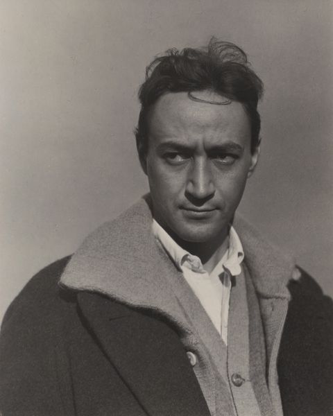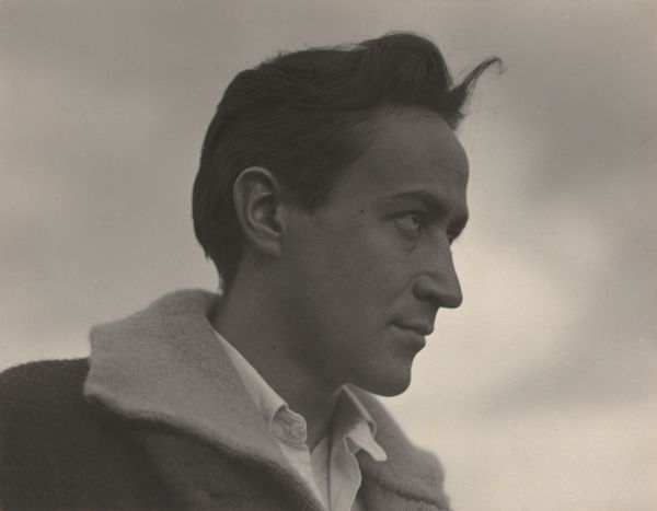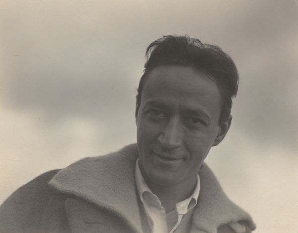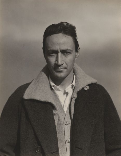 Editor: This is a photograph titled "Jean Toomer," taken in 1925 by Alfred Stieglitz. The subtle gradations of grey and the way the light catches the subject's face give it a captivating depth. What do you see in this piece, focusing on its formal qualities? Curator: Primarily, the tension achieved through the tonal range fascinates me. Stieglitz uses light not to merely illuminate, but to sculpt form. Note how the luminance on Toomer’s face contrasts with the recessive darkness of the overcoat. What is the effect? Editor: It brings his face forward, creating a strong focal point despite the relatively muted palette. There's a palpable sense of immediacy too. Curator: Precisely. And observe how the composition relies on the delicate balance between the structured planes of the garments and the organic curve of the landscape in the background. The planes create the geometry, but also add dynamism to the portrait through the slight unbuttoning of his cardigan and shirt, as well as Toomer's sidelong glance. Does this add or detract from the pictorial whole, do you think? Editor: It enhances the sense of candidness and movement within an otherwise static medium, drawing the eye into the subject's expression. This tension between stillness and dynamism feels very modern. Curator: Yes, and consider how the textures—the wool of the cardigan, the smoothness of the skin—contribute to the overall sensory experience of the image. The delicate rendering of these textures elevates the work beyond a simple likeness, revealing an intricate understanding of photographic materiality. Editor: I hadn't thought about how the texture adds to that dynamic. I'm seeing a new complexity to how light, composition and form coalesce here. Thanks for shedding light on Stieglitz's subtle choices! Curator: A pleasure. Dissecting an image like this reveals how visual choices operate in conversation.