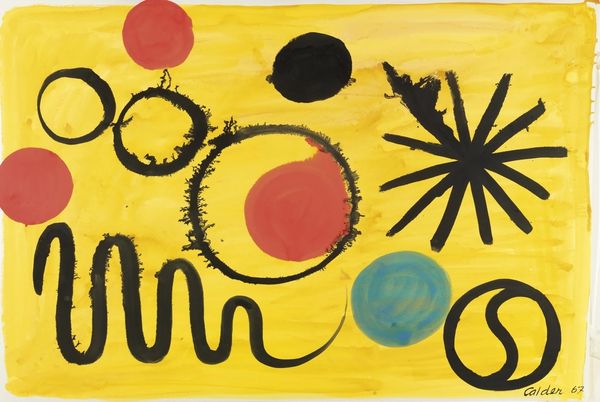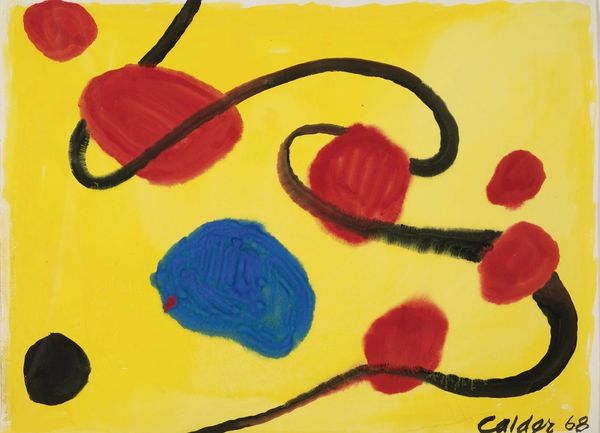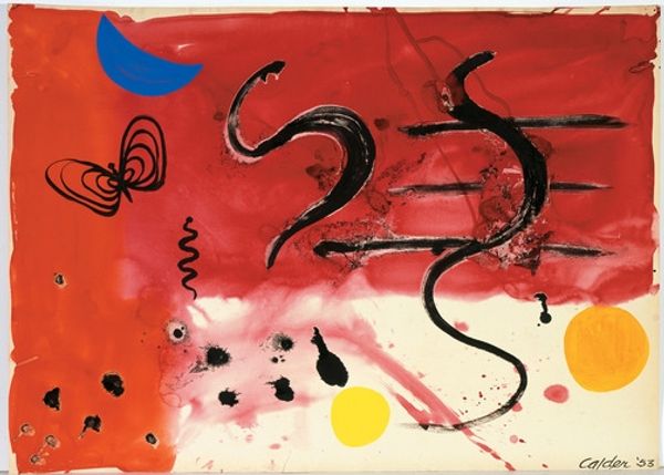 Alexander Calder created this beautiful abstract painting, The Red Dome, probably in the 1960s, with gouache on paper. What strikes me is how Calder lets the materials do their thing. Look at that yellow! He's flooded the background with it, allowing it to bleed and pool. He then uses black and red with the same kind of carefree attitude. It’s this directness that gives the painting its energy. The long, dark, drippy lines, like tendrils reaching across the paper, add a sense of improvisation. They create a playful tension. The way the bottom red dome bleeds into the blue of the ocean could be a subtle reference to the paintings of Helen Frankenthaler, or maybe it's just Calder being Calder. You get the feeling he wasn’t trying to make a grand statement, but rather, enjoying the simple act of putting paint to paper. And that's what makes it so enjoyable to look at.