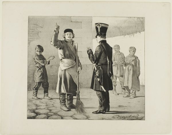 Curator: Well, this lithograph on paper, "Scenes from Russian Folk Life", comes to us from Ignatii Stepanovich Shchedrovskii. It offers us a glimpse into everyday life, though the exact date is unknown. Editor: Immediately, it feels like a stage. Each character, precisely rendered in these cool grays, seems paused, almost waiting for a cue. Is that fair, or am I romanticizing it? Curator: No, I think you're right in noticing the stillness. The artist certainly intended to capture not just a scene, but also something of the social conditions. Look how dress differentiates their occupations and probably their place in the world. The details matter, and create these implicit class observations. Editor: Right, like that gentleman in the foreground seemingly buying something from the peddler. Everyone is dressed very conservatively and that building in the background seems a little desolate. Almost like the lives in this scene. Do you think the artist sees an undercurrent of unease? Or just trying to realistically display a normal interaction in early modern Russia? Curator: It's complex. On one hand, we see the embrace of Realism with a careful rendering of faces, clothing. On the other hand, lithography itself was becoming a widely accessible medium. Its presence here underscores a desire to show everyday life, making it less idealized than traditional academic art might have. Editor: Hmm. I notice the body language, too—almost shy. Their postures, those averted gazes... It reminds me of early street photography when subjects weren't yet used to being captured. This picture has a quiet intensity. Do you agree, or do you read it differently? Curator: Not so much shyness, more the conventions of public behavior, which were tightly scripted in 19th century. Editor: All these nuanced perspectives in this simple print! From our fleeting glimpse into old Russian daily lives to thinking about its reception then versus today, there are some things you can’t just put into words. Curator: Precisely, this lithograph provides not just visual insight but prompts crucial dialogues around the sociopolitical environment that birthed this and shaped its reception through time.