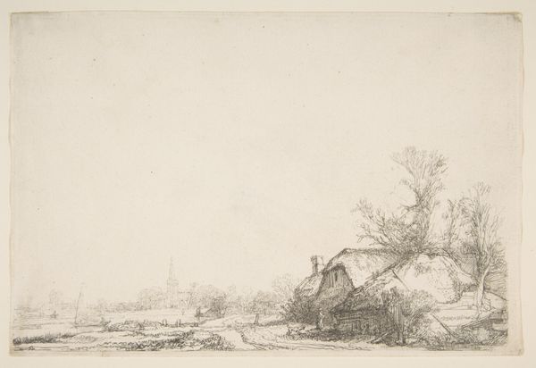 Curator: This is "Bruggetje bij een sloot", or "Bridge over a Ditch", a drawing made with ink on paper by Hermanus Numan, sometime between 1754 and 1825. It is currently held in the Rijksmuseum. Editor: There's an immediate sense of rural life that strikes me; a kind of pre-industrial simplicity in the ramshackle bridge and the small boathouse. Curator: Numan lived through a period of immense social upheaval, experiencing both the Dutch Golden Age and the rise of Enlightenment ideals. It would be intriguing to investigate if Numan deliberately represented in this scene a critique or perhaps a longing for pre-industrial rural settings. Editor: Interesting! My eye is caught by the makeshift construction of the bridge, with its raw timber supports. And notice the way the light plays across the water, rendered through very economical pen strokes. It all seems quite functional. Curator: Right, but consider too that landscape art was becoming increasingly linked to notions of national identity and romanticism. Perhaps, even in this seemingly simple sketch, we can see Numan exploring Dutch identity, particularly through an idyllic lens. It speaks of authenticity perhaps? Editor: I'm drawn to the practicality embedded within. The drawing suggests a deep engagement with the materials at hand – the wood, the ink, even the paper itself, which looks beautifully aged. You can feel the artist experimenting. What labor went into the drawing and the building of such bridges? Curator: And think about how such structures are always points of connection, enabling movement and interaction between people and communities. Yet, in this drawing, we are left with only an indication of these crossings; they are implied more than overtly displayed. This opens us up to interpreting themes like connection, disconnection and transit during the social setting of this drawing. Editor: It highlights how essential infrastructure influences our perception of the rural setting; looking closer it isn't pristine or even untouched. Thanks to you, it also brings in the human story with the materials themselves. Curator: Absolutely. Art gives us a window into not only what existed but what was valued and what issues society might have been grappling with at any point in history. Editor: I'm glad we were able to dig in to both how that era used materials and what it valued.