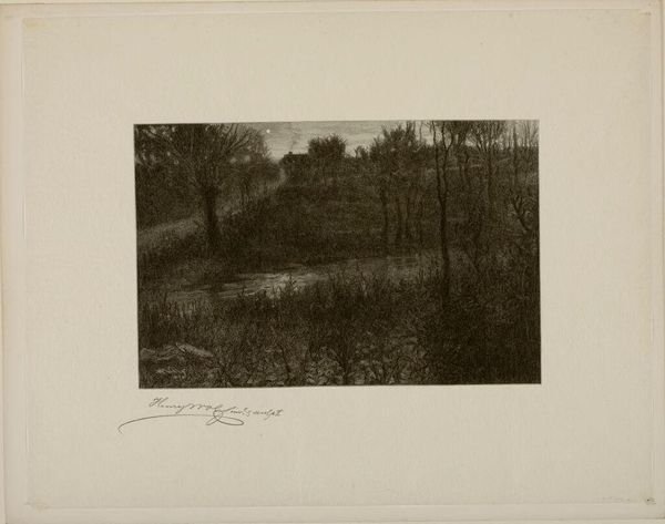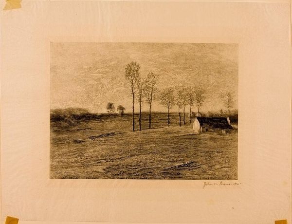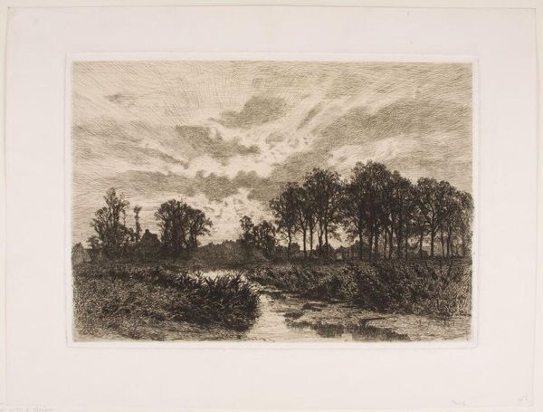 Curator: Before us, we have Alexander Shilling's "Dutch Canal," part of the Harvard Art Museums collection. Editor: Immediately, I'm struck by the print's somber mood. The stark contrasts create a scene both serene and melancholic. Curator: Shilling, active in the late 19th and early 20th centuries, often depicted landscapes with a focus on tonal qualities. This etching is a prime example. He seems to suggest an analysis of the subject through the medium. Editor: Indeed, the canal serves as a compositional spine. The dark, textured foreground gradually softens into the lighter tones of the background, guiding the eye. But, is this depiction of the canal an attempt to evoke the social conditions of the time? Curator: Possibly. Canals were vital for trade, but also reflected the industrial growth impacting rural life. Shilling might be commenting on the changing landscape and its socioeconomic implications. Editor: I concede. The print's formal structure—the way light and shadow interact—certainly evokes deeper meanings beyond the purely aesthetic. Curator: Precisely. Art transcends mere depiction; it offers insights into society and ourselves. Editor: A worthwhile reflection; Shilling’s work invites us to ponder the landscape's role in shaping social narratives.