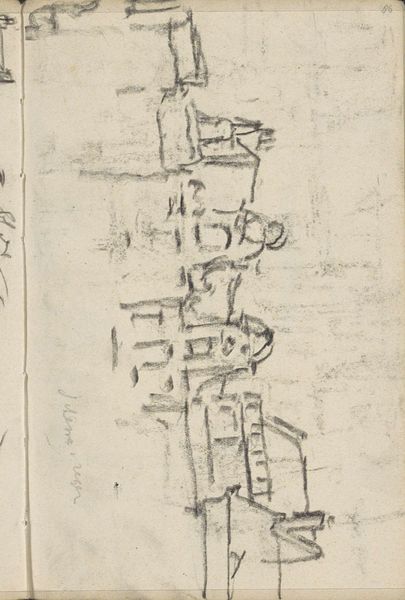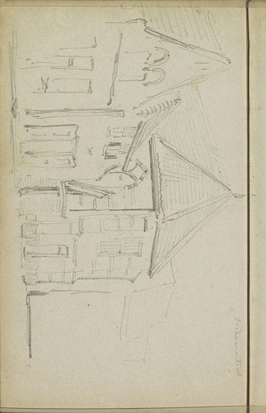 Curator: Here we have "Gezicht op het Spui te Amsterdam" – a cityscape by George Hendrik Breitner, dating from somewhere between 1906 and 1923. It's a pencil drawing, currently held in the Rijksmuseum. Editor: My first thought is that it’s incredibly spare, almost skeletal. The pencil strokes seem quick, searching. There's a real sense of capturing a fleeting moment, a ghost of a place. Curator: Breitner was deeply involved in portraying Amsterdam and its people during a period of rapid urbanization. The Spui, once a canal, had been filled in – a physical representation of the changing city. This sketch is one of many city views, and gives a view to his artistic production, in which series, themes and methods evolved over years, not isolated works. Editor: Absolutely. You can see that in the technique, which almost verges on abstraction. He's not trying to replicate the scene exactly; instead, he’s using lines and form to give a distilled essence. Notice how he suggests volume and depth using only a few, carefully placed strokes. Curator: And it's worth thinking about what he's omitting. We are left to imagine so much—the color, the bustle of people. He captured the spirit of place and time in this pencil drawing, though one should remember that his larger cityscapes were far more critical and dramatic than these calm urban sketches. Editor: It makes the viewer actively participate in constructing the image. It's quite modernist in its reliance on suggestion rather than representation, don't you think? Also, the relative lightness of the work allows a feeling of hope, a way out despite any difficulties. Curator: Yes, and it speaks to his interest in capturing the transient nature of modern life, the fleeting moment. Though Breitner himself became an iconic figure, an establishment presence who critiqued the status quo while profiting from the market, we see also his early interest and embrace of modernist sensibilities of the time, and his complex relationships to various audiences throughout his lifetime. Editor: Looking again, there's also a raw immediacy that resonates. I admire the artist's economy of expression; I find its elegance arresting. Curator: A powerful image and a very complex and thoughtful man whose full range can be glimpsed here in this deceptively simple form.