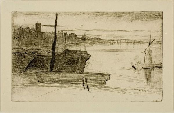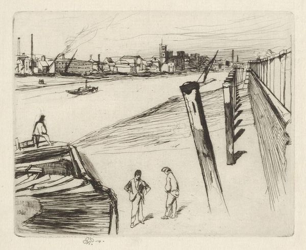 Editor: This is Johannes Bosboom’s "Straat met figuren naast een duin in Scheveningen," created around 1873 using pencil and pen. It has a quiet, almost desolate mood to me, like a fleeting memory captured on paper. What do you see in this piece, Professor? Curator: The essence of this sketch lies in its masterful rendering of light and form. Note how Bosboom uses simple lines to define the architectural volumes against the stark landscape. Observe how the contrast is the primary compositional technique. Editor: The lines *are* quite striking, particularly how they seem to define the planes of the buildings and dunes. Almost like geometric shapes. Curator: Precisely. Semiotically, the recurring geometric forms represent the human imposition of order on nature's randomness, with individual signs creating complex, connotative meanings. But observe too, the tonal variations within the work itself, especially between the shadows cast against the structures, lending three-dimensionality. It asks how is space signified. Editor: So, it’s the formal relationship between these geometric shapes and their light and shadow that's most important? Curator: Indeed. And in these terms we also ought to address the medium –the drawing, with its tentative lines, has an immediacy that a more polished work might lack. Bosboom allows the viewer access to his process. Does this influence our assessment of the work? Editor: It does add another layer to the experience; I agree. It’s been helpful to examine his creative practice by appreciating those specific aspects of it! Curator: This structural understanding enhances the aesthetic engagement. The art becomes less about the subject and more about how the subject is presented as an organization of structural values.