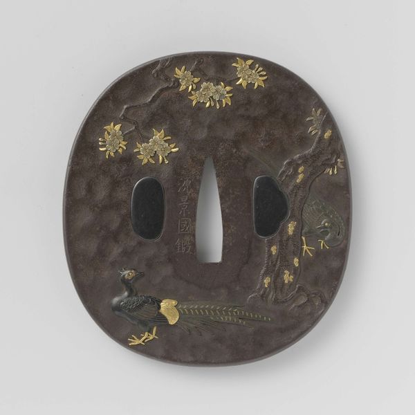 Crafted by Kansai in the late 19th or early 20th century, this sword guard, or tsuba, merges the functional with the decorative through its composition and materiality. The dark iron is inlaid with gold, depicting a carp swimming amidst seaweed. The carp, rendered in striking relief, breaks free from the flat plane of the guard, creating a dynamic tension that engages the viewer's eye. The arrangement of the seaweed in the top and bottom left corners of the guard creates a mirrored symmetry. This is destabilized by the angled body of the fish on the right, which directs the viewer's focus. Kansai uses the tension between symmetry and asymmetry to create a viewing experience which is not merely decorative, but active. Consider how the textured surface of the iron both absorbs and reflects light, animating the scene and underscoring the organic fluidity of the water. This interplay between light and shadow deepens the visual narrative. Through its form and materiality, the tsuba transcends its function as a mere sword fitting, emerging as a complex object.