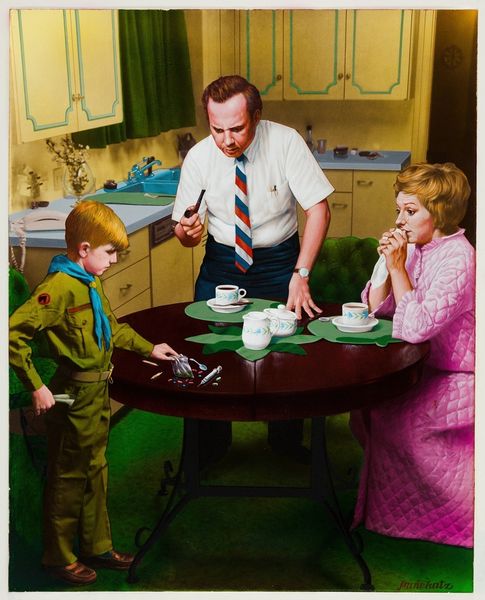 "Fast Food Fatality" by Don Ivan Punchatz, is a painting with no date, yet it oozes the late 70s, early 80s. The colours here are so upfront, right? Like, BAM, yellow and blue, but then he sneaks in all these flesh tones and browns, which is actually kinda unsettling. Look at the way he renders these faces – they’re almost cartoonish, but with this undercurrent of something darker. The Ronald McDonald looking man looks like he is about to whack someone, the painting has so much tension. Is that a ray gun to our right of the server? You can almost feel the greasy spoon smell, you know? It reminds me a bit of Peter Saul, that same kind of wild energy and biting satire, even if the approach is different. It’s like Punchatz is saying, hey, we’re all in this messy, funny, kinda messed-up world together, enjoy your burger!