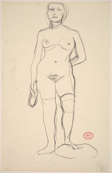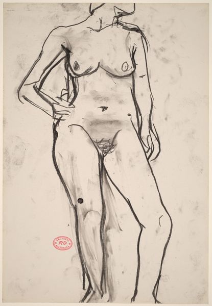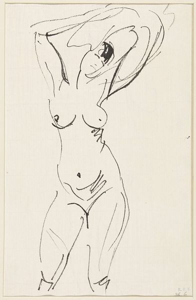 Curator: Vilhelm Lundstrom's "Stående kvindelig model," created between 1921 and 1923, presents a standing female nude rendered in ink. It resides at the SMK, the National Gallery of Denmark. Editor: Immediately striking is the dynamism, wouldn’t you say? The bold, gestural lines evoke such raw energy, despite the static pose. There's almost a violence in the way the ink has been applied, splattered even. Curator: Indeed. Lundstrom was working within a modernist framework. His focus wasn't on exact representation, but on conveying essential form and expression. The looseness certainly aligns with broader social changes. One could argue that, following the First World War, traditional depictions of women, so tightly controlled, became less palatable. This sketch seems to resist that controlled representation, doesn't it? Editor: Precisely, and that resistance is embedded within the artistic approach itself. Look at the negative space—it's as vital as the lines defining the figure. Semiotically speaking, these elements combined trigger the senses to interpret the image. Curator: Interesting point, particularly regarding interpretation. There's something both vulnerable and powerful in this seemingly unfinished work. How the female form has historically been a battleground for control and representation by a dominating patriarchal structure... Do you find it empowering that we are offered an image that is raw and unfished instead of sexualized or an object of male desire? Editor: The rawness of the application evokes movement that defies our usual idea about portrait. We lose precision of a traditional drawing in exchange for expressive movement. I do appreciate the way the artist utilizes simplicity. One might be tempted to add flourishes, embellishments. This demonstrates great artistic maturity. Curator: And perhaps reveals more of our projected cultural assumptions about femininity than of the figure herself? Editor: Precisely! I'm convinced that any artistic method is a method to reflect on art, artist, model and spectator at the same time. A powerful work on the gaze and the method! Curator: I concur; a stimulating piece with which to begin our exploration of form and representation.
