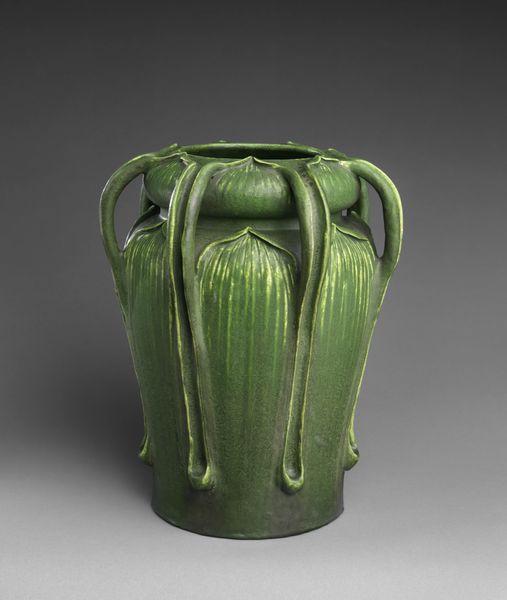 Curator: Standing before us is an earthenware vase crafted by William J. Walley sometime between 1893 and 1903. It is aptly titled "Vase with Satyr-head handles." Editor: It strikes me immediately as something ancient, yet also subtly menacing. The green glaze gives it an earthy feel, but those satyr heads—are they grinning or grimacing? Curator: The satyr heads are a fascinating allusion, grounding the piece in Greek and Roman traditions while reflecting the American art pottery movement’s engagement with classical forms. It suggests an appropriation and reinterpretation of European aesthetics, fitting within the broader context of American artistic identity formation during the late 19th century. Editor: Absolutely. Satyrs themselves are potent symbols, representing the duality of human nature—part human, part animal. Those expressive satyr heads also serve a functional purpose as handles, so we have this interesting interplay of practicality and symbolic weight. The choice of green too…perhaps suggesting growth or decay? Curator: Given the period, I think we must also consider the societal function of such an object. This vase likely occupied a prominent place within a domestic setting, indicating a cultivated taste. It certainly speaks to the aspirational desires of the late-Victorian middle class to acquire objects that evoked classical learning and refinement. Editor: That context of display is critical. It is almost as if this satyr embodies a certain rebellious spirit caged within polite society. Do you think the relative darkness in the facial area suggests inner-turmoil? Curator: Perhaps. I am more inclined to see it as a nod toward prevailing attitudes. The deliberate craftsmanship in those handles presents a clear assertion about its owner’s socio-economic status, subtly reaffirming a cultural hierarchy. Editor: I like the point about status! And the tension is amazing; these faces are neither comforting nor hostile. There is just this watchful stillness that implies they could shift into either emotional mode, like a coin flip between Dionysian revelry and some unspoken consequence of excess. It is a fascinating little drama. Curator: Indeed, it's a work that continues to prompt dialogue around aesthetics, historical narratives, and socio-political realities, particularly in late 19th century America. Editor: And for me, this object's symbolic tension shows a rich reflection of a society grappling with its own identity.