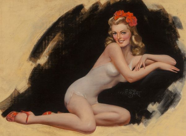 Edwin Georgi, a prolific American illustrator, created this piece titled Nude at an unknown date. Georgi's career peaked in the mid-20th century when his work regularly appeared in magazines like Vogue and Harper’s Bazaar. The woman’s gaze is averted, and her pose seems relaxed and confident in her sexuality. Georgi's nudes often challenge the conventional male gaze by presenting women as self-assured and in control of their own sensuality. The delicate brushstrokes and soft color palette contribute to an atmosphere of intimacy and quiet contemplation. While the artwork does not explicitly address race or class, the figure's idealized features and stylish presentation reflect the aesthetic standards of the time, which often prioritized white, middle-class beauty. This piece offers a moment of quiet reflection and a glimpse into the complex interplay between beauty, representation, and identity.