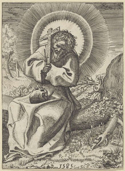 Curator: Annibale Carracci's "Saint Jerome in the Wilderness," now housed at the Harvard Art Museums, presents a compelling image of the saint in devotion. Editor: The etching is immediately striking—the stark lines conveying a raw, almost painful intensity in Jerome's expression. The halo practically vibrates! Curator: This piece reflects the Counter-Reformation's emphasis on personal piety. Jerome, a Doctor of the Church, became a potent symbol of scholarly devotion and penitence. Editor: Absolutely. The skull, the crucifix formed of branches, the books—they're all carefully placed symbols reminding us of mortality, faith, and knowledge, cornerstones of Jerome’s hermetic life. Curator: The composition situates him deliberately within a sparse wilderness, emphasizing his withdrawal from worldly affairs and his focus on spiritual matters. Editor: For me, the most enduring aspect is the emotional charge – Carracci uses these established symbols to stir genuine feelings of empathy and awe. Curator: Precisely. It's a demonstration of how art serves to inspire faith and introspection, particularly during a time of religious conflict. Editor: A visual reminder of the power of symbols to evoke complex human experiences, across time.
