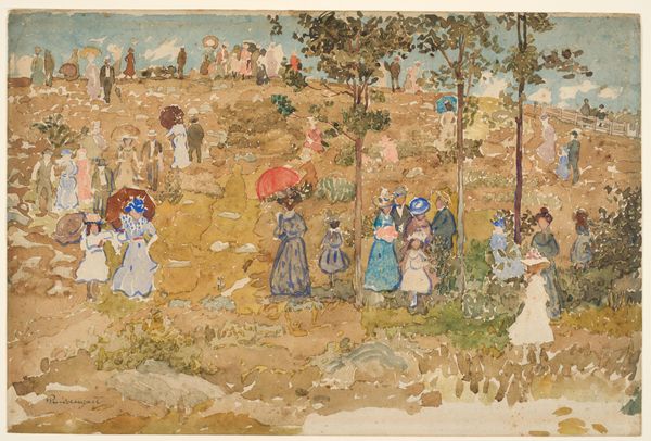 Maurice Prendergast created this watercolor painting of the Terrace Bridge in Central Park. It's a bustling scene brought to life through fluid, translucent washes of color. Watercolor is a medium associated with immediacy, capturing fleeting moments. The quick strokes and diluted pigments suggest a scene observed in real-time, imbuing the artwork with a sense of spontaneity. Prendergast's light touch with the brush allows the paper's surface to show through, adding texture and luminosity to the composition. Beyond the aesthetic qualities, Prendergast's choice of watercolor speaks to accessibility and portability, which were important to the artist. The medium allowed for an easy observation and documentation of everyday life, breaking with traditional art history. The Terrace Bridge comes alive thanks to the artist's chosen medium and offers a unique perspective on a public space where social classes intermingle.