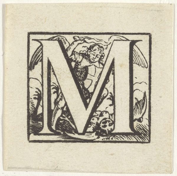 Curator: This engraving, titled "Gehistorieerde initiaal W met de vis die Jona uitspuugt"—"Historiated initial W with the fish spitting out Jonah"—was crafted by Dirck de Bray sometime between 1635 and 1694. It employs a simple woodcut effect to render a truly remarkable scene. What are your initial impressions? Editor: Well, it's compact, and that high-contrast black and white scheme gives it an immediate dramatic flair. There's an intriguing story being told here, compressed within the boundaries of this single letter "W". Curator: Precisely. Historiated initials like these, particularly prevalent during the medieval period and experiencing a revival during the Baroque era, serve as far more than mere decorative elements; they become powerful tools of narrative and ideology. The use of engraving enabled De Bray to distribute his work to a wider audience. Editor: Seeing Jonah spewed out by the whale certainly resonates. In our cultural memory, this imagery is not only of religious rebirth but also of reckoning with one's choices. Curator: I think you are absolutely right. It served a powerful message about atonement, designed for a public intimately familiar with biblical narratives, such imagery reinforced the power and presence of the church in everyday life. Editor: Indeed. The inclusion of the ship, and the settlement within the negative space formed by the W, it's almost like the promise of a return, the restoration of a place and status after enduring this tumultuous, almost violent cleansing. It reinforces ideas of grace and resilience. Curator: Yes, this particular rendering uses the familiar iconography to provide insight on the historical, and often tumultuous, societal challenges the Netherlands faced during that time period. It shows how this period embraced symbolic language. Editor: Analyzing how De Bray intertwines religious motifs and letters reveals insights into society's complex mindset. A world in turmoil seen from the eye of the storm—what an extraordinary feat for such a compact piece! Curator: This small engraving showcases the complex interplay between artistry, religion, and the evolving societal landscape in the 17th century. Editor: It certainly serves as a potent reminder of art's capacity to encapsulate pivotal moments and symbols within compact forms.