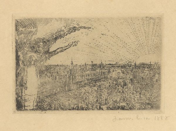 James Ensor likely created this etching, "Verovering van een vreemde stad," with a metal plate, acid, and a printing press. The image's fine lines and intricate details are achieved through a labor-intensive process of etching, where the artist carefully incises lines into the metal, which are then bitten by acid to hold ink. The material qualities of the etching—its delicate lines and tonal range—create a dreamlike depiction of a city. This is reinforced by the social context in which Ensor made his art; his etchings often reflected anxieties about industrialization and social upheaval. The meticulous work required for etching stands in stark contrast to the industrialized processes transforming society. By employing traditional craft techniques, Ensor challenges the dominance of mass-produced imagery, asserting the value of individual skill. The act of etching becomes a form of resistance, reclaiming agency in a world increasingly shaped by capitalist forces. In the end, we see how materials, process, and social context converge to give the artwork its full meaning, blurring the line between fine art and craft.