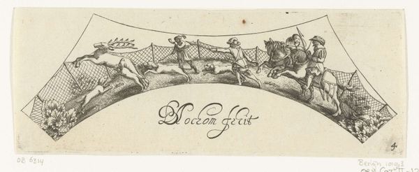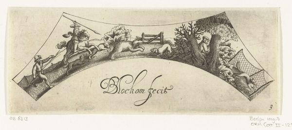 Editor: We're looking at "Hertenjacht," or "Deer Hunt," an engraving by Bartholomeus van Lochom, circa 1630. The curved composition is interesting. It makes me think this image might have been part of something larger, like a fan? What captures your attention when you see this piece? Curator: Oh, definitely! It whispers tales of tapestry and fan designs, doesn't it? Van Lochom's "Deer Hunt" dances on the edge of genres. History, narrative, landscape – it’s a swirl of 17th-century sensibilities, filtered through a printmaker's eye. That urgent chase, the clash of hooves and paws, it feels very much like being there, don't you think? What's it saying to you, in a whisper or shout? Editor: The curve definitely makes it more dynamic; the way the deer seem to burst out of the thicket. How does it tie into the whole Dutch Golden Age style, though? Curator: The Golden Age was all about this explosion of detail, right? Lochom fits right in with this narrative tradition! This hunt could almost be a scene ripped from a larger history painting. And think about the patronage – who wanted these images? What stories were important to them? Perhaps this small engraving offered the gentry a glimpse into their own privileged pastimes? Or their imagined ancestral roots? Editor: That's interesting! It reframes my initial sense of "dynamism" towards maybe a "controlled excitement"... a way of seeing their status validated. I really hadn't considered it from that angle. Curator: Exactly! Art has that slippery, wonderful way of changing its shape, doesn't it? I leave with the same refreshed sentiment, thank you for that little insight.