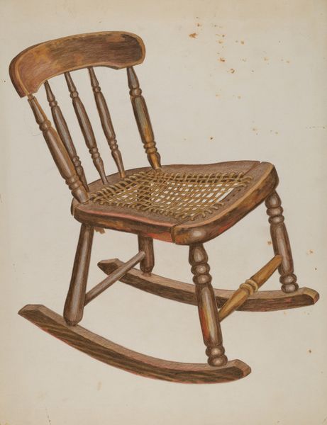 This watercolor shows a child's rocking chair, likely made in the late 19th or early 20th century. It's made primarily of wood, with a woven seat and decorative details. The chair's material qualities speak to a specific moment in American craft and industry. Wood was readily available, but shaping it into a chair required skill. Notice the turned legs and spindles, evidence of lathe work. The woven seat suggests a familiarity with caning or other textile crafts, probably done by women. The painted decoration, though simple, adds a touch of personalization, elevating a functional object to something cherished. The fact that this is a child's chair makes it even more poignant. It speaks to the care and attention given to children, even in a time when life was often hard. The rocking motion itself is comforting, suggesting a sense of domestic tranquility. Objects like these remind us that even the simplest things can be rich with meaning, reflecting the skills, values, and social context of their creation.