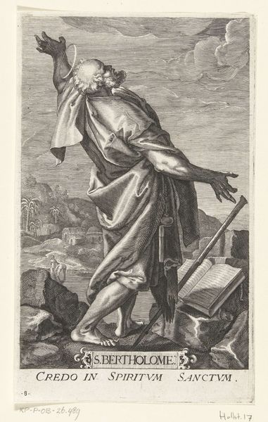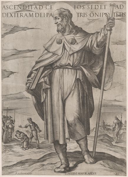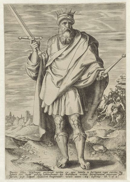 Editor: So, this engraving, “Pharaon,” created sometime between 1634 and 1645 by Gilles Rousselet, strikes me as… unusual. The figure of Pharaoh feels almost theatrical, and then the architecture in the background just adds to that strangeness. What catches your eye when you look at it? Curator: Immediately, the combination of symbols leaps out. We see classical Roman armour juxtaposed with what is meant to represent ancient Egyptian imagery: pyramids and obelisks, of course, but rendered through a distinctly European lens. Do you see the somewhat awkward, performative quality of that? Editor: I do now that you mention it. It's like he's wearing a costume rather than depicting something genuine. Curator: Exactly. Think about the cultural memory embedded within representations of power. Why Rome instead of Egypt? Why the flamboyant headdress that resembles less a pharaoh's nemes and more like the fanciful feathered creations that court figures donned? Editor: I guess it’s trying to translate a foreign power into terms a 17th-century European audience could understand? Curator: Precisely. It’s not really about representing the historical Pharaoh; it's about crafting a European ideal of exotic, powerful, even somewhat barbaric rulership. What feelings does it invoke for you now? Editor: Now, knowing all that, it feels a bit like a political statement about power, or at least how power was perceived back then. It's fascinating how images can be loaded with that sort of cultural baggage. Curator: Indeed. Visual symbols function as cultural shorthand; they carry tremendous weight through time, revealing how societies understand and often *misunderstand* one another. This is an image deeply rooted in its specific time. Editor: Definitely a new perspective for me to consider. Thanks!