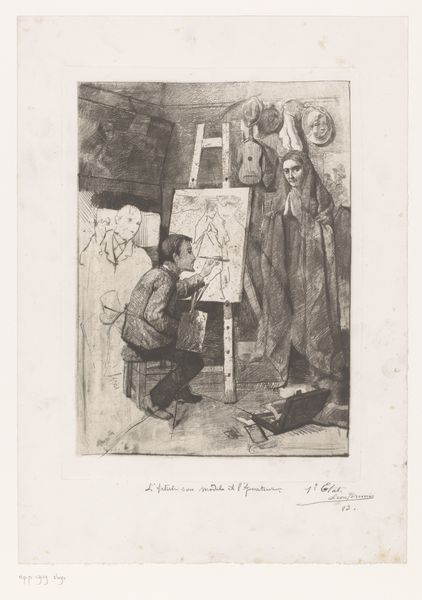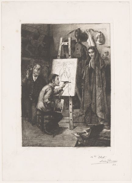 Editor: So, this is Léon Brunin's "Painter, his model and an art lover in the studio," an etching from 1883. I’m immediately struck by the intimacy of the scene and the somewhat staged quality of it. What symbolic narratives are unfolding here for you? Curator: It is compelling, isn’t it? This scene presents a sort of trinity: artist, muse, and beholder. The artist captures an idealized vision, while the "art lover" observes the alchemy. Consider the items in the background - masks, statues and canvases depicting historical scenes. What might those symbols convey about artistic ambition and the burden of legacy? Editor: Perhaps they hint at the artist's aspirations to create timeless work, to emulate the masters? It almost feels like he's wrestling with tradition, trying to find his place within that historical lineage. Curator: Precisely. The woman stands rigidly, embodying idealized beauty. Is she an individual, or a representation of Beauty itself? Notice the contrast in expressions – the painter is focused and alert; the art lover looks almost paternal; the model…resigned? Are they simply characters in a scene, or something deeper? Editor: I see what you mean. Their body language suggests these deeper symbolic layers. What do you make of the somewhat cramped space? Does that signify something too? Curator: Perhaps the limited space suggests the confines of the artistic process, the artist wrestling with inspiration. Also, note the medium, an etching intended for prints – easily reproduced and circulated. Does the symbol of art, artists and creativity here allow it to become accessible to many and thus immortalize them? Editor: It's fascinating to think about how the etching as a medium relates to the theme of artistic representation and circulation of ideas. Thank you; that really opened up some new ways of seeing this piece for me. Curator: And for me as well! The artwork becomes a mirror reflecting the ambitions and anxieties embedded in the art world.