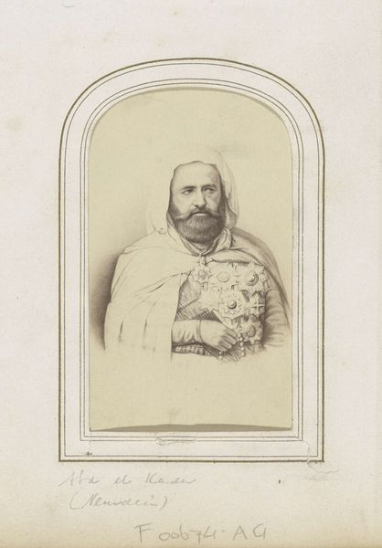 Curator: This drawing, attributed to an anonymous artist and dated from 1830 to 1874, presents a portrait of Abd el-Kader, the bey of Mascara. It is executed in pencil. Editor: There's an air of both power and vulnerability about this image, wouldn't you say? It is captivating in its rendering of textures and shading. The gaze is steady, yet something in the set of the jaw suggests inner turmoil. Curator: Precisely. The choice of pencil emphasizes realism and brings us into immediate connection with the subject. His attire holds tremendous meaning; we note the headdress, cape and, prominently displayed, the array of ceremonial swords, all pointing to leadership, nobility and deep Islamic roots. The tassels denote elegance and refined status. Editor: Absolutely. Abd el-Kader was a pivotal figure during the French colonization of Algeria. Examining this portrait necessitates a reflection on orientalism, French imperialism, and the representation of Arab leaders within Western artistic frameworks. What purpose did these portraits serve in shaping perceptions and reinforcing power structures? Curator: Excellent question. It embodies history, memory, identity. Abd el-Kader emerged not only as a political but also a spiritual icon for many. His appearance itself became symbolic, charged with meanings layered by resistance, diplomacy, exile, and religious contemplation. Even the swords symbolize, in an archetypal way, preparedness. Editor: And what about the subtle shadows under his eyes? They perhaps indicate fatigue, or a burdened consciousness related to leadership under the shadow of conflict. These could also subtly align him within pre-established tropes within European depictions of the exotic "other." It's imperative that we analyze these depictions with careful historical context and critique. Curator: I agree completely, understanding context and symbolism unlocks a richer meaning from these historic portrayals. Ultimately, it reminds us that objects such as drawings serve as silent witnesses to history, waiting to disclose the multi-faceted truths they encapsulate. Editor: Precisely; examining this portrait provokes thought, it compels us to contemplate colonial power relations, individual agency, and the intricate relationship between art and identity. These conversations remind us of our collective duty toward conscientiously engaging with history through visuals.