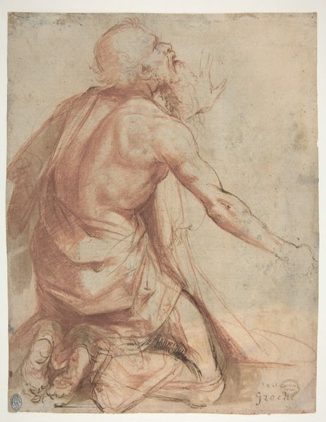Curator: The expressiveness in this chalk, charcoal, and pencil drawing of Saint Jerome from after 1590 by Agostino Carracci is arresting. The reddish-brown tonality immediately evokes warmth, even against the austerity associated with the saint. What are your initial impressions? Editor: I immediately notice the vulnerability in his pose—the way his hands are clasped almost protectively. Given that St. Jerome dedicated himself to translating the Bible and grappling with profound religious texts, one can imagine him wrestling with doubt and faith amidst patriarchal systems that constrained even his interpretations. The red chalk reads as blood, life and even sacrifice. Curator: I agree. Carracci’s expert handling of the materials adds to this sense of immediacy. Notice the visible layers of chalk and charcoal, almost like archaeological strata. It invites speculation: Did Carracci have a particular model? Was he concerned with realism in the presentation of Saint Jerome? Editor: Absolutely. But perhaps realism wasn’t the sole concern, rather, the process highlights the human condition through Jerome. What are the politics embedded in depictions of powerful religious figures made by powerful and influential (presumably male) artists during this time? What do images like this do to reinforce existing hierarchies? Curator: That is certainly part of it. Carracci's choice to use such accessible materials - chalk, pencil, paper, charcoal - moves away from the notion of rarefied art production. The Saint becomes more approachable. His intellect remains elevated, while the creation of his representation seems more commonplace. Editor: True. Yet the choice of St. Jerome himself reinforces an interesting narrative: the learned male scholar positioned centrally in theological history and debate, a somewhat privileged status. I wonder how depictions of St. Jerome from the same period compare across different social and gender contexts? Did women portray the Saint in vastly different ways, or did their representations mirror the works of prominent artists like Carracci? Curator: Those are valid considerations. For me, though, the immediacy of the artistic labor really stands out; we see process, materiality, and skill. That’s hard to ignore! Editor: I appreciate you pointing that out. These are interesting entry points through which to unpack complex, and sometimes contradictory meanings embedded in visual culture.