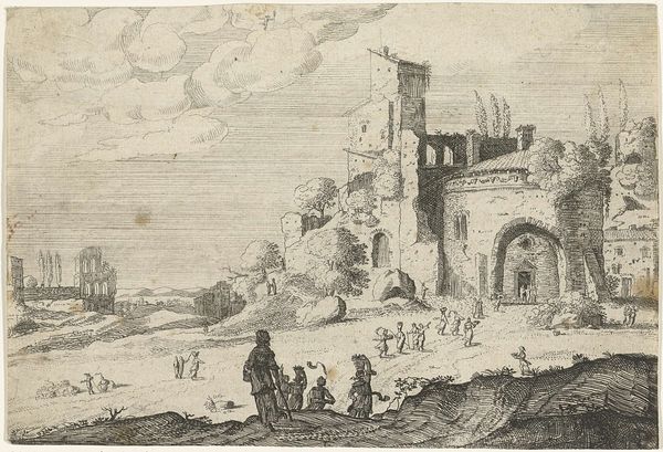 Curator: Here we have an engraving from the Rijksmuseum collection entitled "Landschap met ruïne," or "Landscape with Ruin." It's attributed to an anonymous artist, and its creation is dated somewhat broadly, anywhere between 1600 and 1833. Editor: The ruin certainly sets a melancholic tone, doesn't it? The crisp line work of the engraving actually enhances the feeling of desolation, even with those figures in the foreground. It's a reminder of the transience of even the grandest constructions. Curator: Yes, there is a real starkness in the scene. I'm drawn to the details of how that starkness was achieved. Look closely at the lines, the way the engraver varies the weight to create texture and depth on the stonework of that prominent, rounded ruin. It indicates considerable skill, using tools and methods that had been practiced and refined for centuries. The material of the copper plate and the tools used leave their own distinct mark. Editor: The ruin really is central to the composition, rising up on that gentle hillock. Its rounded form, and even the way it seems to partially echo the shape of the clouds, speaks of enduring power even in decay. And the other architectural features dotted about—the more angular building, and that odd spire on the right—add to this feeling of past grandeur. Do you feel it speaks of vanitas, that symbolic meditation on the futility of earthly life and its pleasures? Curator: Interesting that you pick up on the vanitas symbolism. My attention, though, shifts toward the less romantic aspects. How the act of printmaking allows for this scene to be easily replicated, disseminated, possessed, perhaps by merchants or landlords as reminders of both past wealth and the raw materials still at their disposal. Consider the socio-economic realities intertwined with even a melancholic ruin. Editor: Yes, the economics of its production and distribution are undeniably important. But let’s not overlook how this relatively inexpensive image could bring a taste of high culture to a wider audience, allowing them to participate in shared symbolic landscapes, histories, and feelings about mortality, all carried in these distinct visual symbols. Curator: I suppose when we pull back a bit, we are both grappling with different sides of how materials and symbols are inextricably intertwined in a piece like this, from its creation, to distribution, and now its presence here in the museum collection. Editor: Absolutely, seeing its symbolic depth contextualized alongside material and making reveals its full potential.