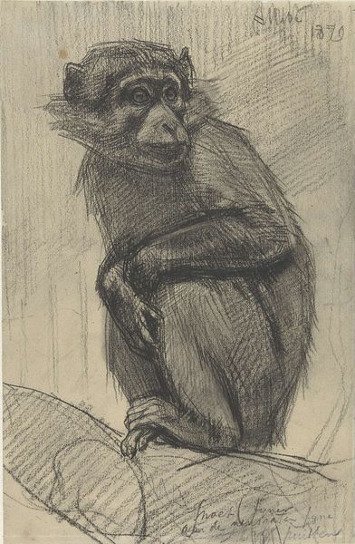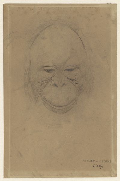Editor: This is Theo van Hoytema’s "Apenkop," made sometime between 1878 and 1890. It's a pencil drawing and incredibly detailed. What strikes me most is how human the monkey appears. What do you see in this portrait? Curator: The enduring human fascination with simian forms. We've projected our fears, desires, and reflections onto apes for centuries, a visual tradition with complex roots. Does this image tap into that collective memory for you? Editor: Absolutely. Looking at its face, I can see the subtle intelligence in its eyes and how much it reflects our own, maybe reminding us of our shared ancestry. But is there anything beyond just the human connection? Curator: Think about what else this image evokes. Primates, often inhabiting the "wild," might be interpreted through the symbols of freedom and untamed nature but, depending on cultural context, can sometimes indicate negative traits that we unconsciously project as a collective. Could Van Hoytema be inviting us to confront these contradictions within ourselves? Editor: It’s interesting that something as seemingly simple as a portrait of an ape can contain so much historical and symbolic weight. I hadn't thought of those projected assumptions. Curator: Precisely! Images often function as mirrors, reflecting our inner landscape through the language of symbols and archetypes. Art challenges us to decode this visual vocabulary, revealing the layers of meaning we carry within us. Editor: Thanks! I see this image in a new light, it’s more than just a drawing, it’s also about the symbolism we attach to other species.