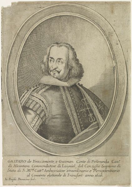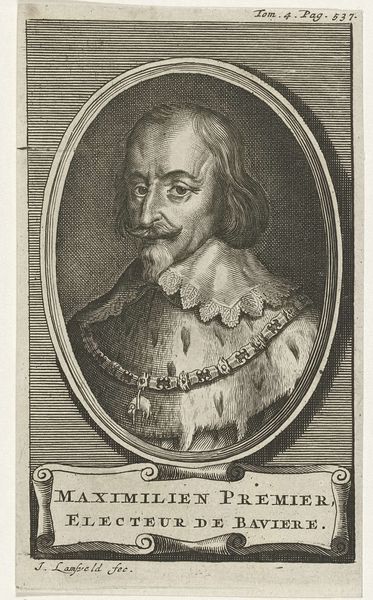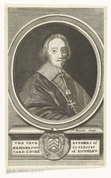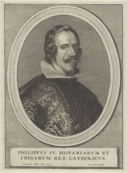 This is Bernard Picart's portrait of Philip IV, King of Spain. It's an etching, a print made by incising lines into a metal plate, dating from the late 17th to early 18th century. The composition immediately draws your eye to the oval frame, a classical motif, which contains the king's likeness. Note how Picart uses hatching and cross-hatching to build up tone, creating depth and volume in the figure. The lines are denser in the shadows, giving weight to the king’s face and clothing, and sparser in the highlights, which illuminate his features. Consider how the oval format itself functions here. It’s a contained space, almost like a lens focusing our attention. The frame sets up a binary: the controlled image of the king versus the implied chaos of the world outside. Yet, the very act of framing also destabilizes the notion of absolute power. It reminds us that representation is always mediated, always constructed. This interplay between form and representation challenges any fixed meaning, allowing for ongoing interpretation.